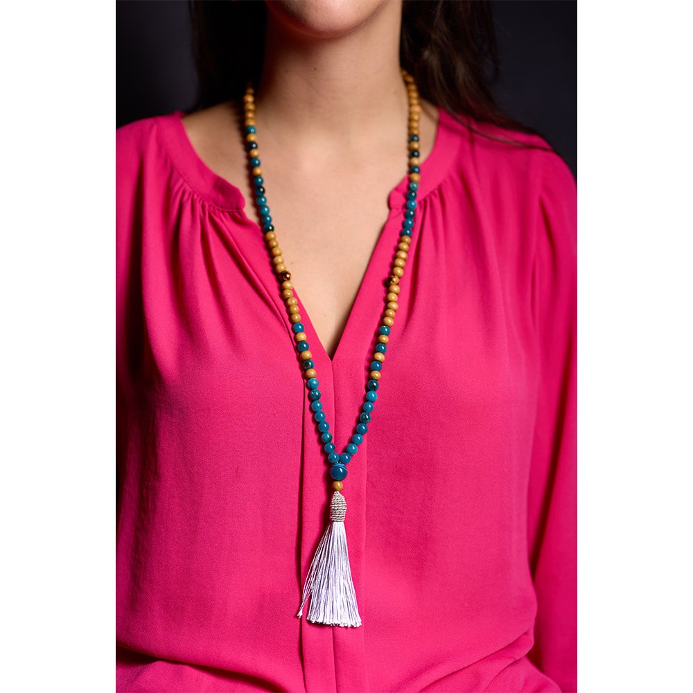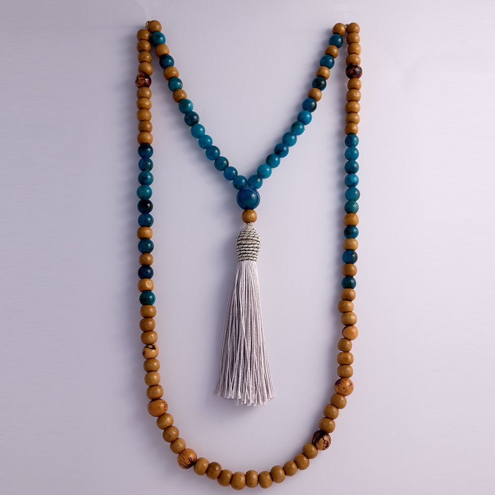 108 contas – madeira clara, Apatita tingida, semente de açaí com verniz e mero de Agáta tingida
